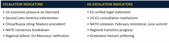 Critical vulnerabilities—particularly Greenland and rules-based order erosion—require immediate crisis management protocols.
