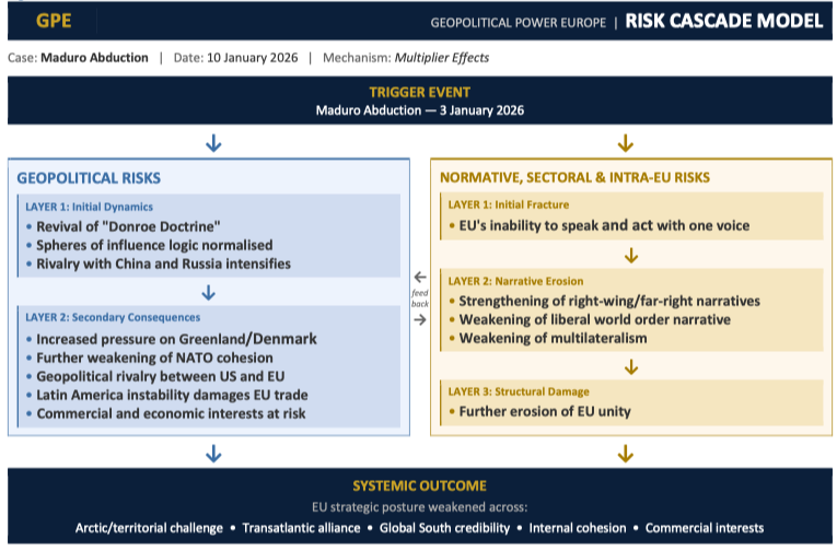 The Maduro abduction is a stress test of Europe’s claim to be a geopolitical actor grounded in law. The critical vulnerability is not Venezuela itself—it is Greenland, where sphere-of-influence logic meets EU territorial interests. Risks cascade through interconnected channels, operating as multipliers rather than discrete challenges. Effective response requires clearer legal stance articulation, proactive Latin American diplomatic engagement, Arctic contingency protocols, and systemic resilience across risk categories.